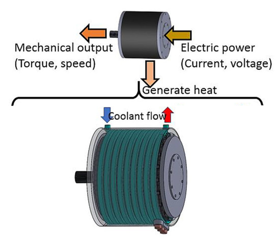 The motor and battery are two of the most significant components of an electric drive train. Elements that have a significant impact on an electric motor’s ability to use renewable energy for eco-friendly mobility include high power density, compact design, and high levels of efficiency. New generations of EVs have better batteries and motors that are cleaner and more fuel-efficient. One of the most important components in emerging vehicle architectures is EMs. These EMs produce significant amounts of heat during their operating and drive cycles. With an ambient temperature of 25 °C and a motor running at 7000 rpm, the motor temperature of an EV can reach more than 80 °C [50]. To offer maximum torque, high torque electric motors can be combined with high voltage batteries; however, they add weight to the system. Despite their tremendous efficiency, they also produce a significant amount of heat that must be evacuated. Lower temperatures may be acceptable, but greater temperatures may necessitate a reduction in power to maintain functionality. Even more crucial is the high voltage battery, which can only function within a specified temperature range and rapidly degrades due to heat expansion outside of this window. The heat generated by the motor during operation has a negative impact on its overall motor efficiency. The electric motor’s torque and rotational speed are influenced by its temperature and internal losses, some of the losses include stator core losses and rotor core losses. Hence, it is very important that the temperature rise must be restricted to safe levels in order to maintain the enhanced motor’s lifespan and for better driving efficiency. It is obvious that to prevent damage to the machine, the amount of heat generated must be effectively removed with appropriate cooling methods [51].