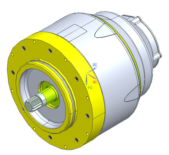 As shown in Figure 8a,b, the basic shape of EM geometry is a cylindrically structured housing with an inlet and outlet water-cooling connections. The internal radius of the EM geometry is 93.00 mm, while the outward external radius is 106.25 mm. The housing has a thickness of AlSi10Mg (Aluminum alloy) which is 13.25 mm and the overall length of the motor is 248.00 mm. These values are taken from the EM geometry which is mentioned in Figure 6.