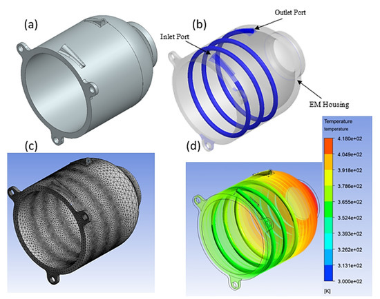 (a) CAD Geometry–EM housing. (b) CAD Geometry of helical water-cooling jacket. (c) Helical water jacket geometry meshing. (d) Motor housing temperature distribution with helical water jacket.