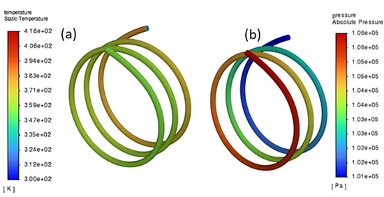 (a) Helical geometry temperature distribution. (b) Helical geometry pressure distribution.