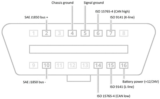 The female 16-pin (2 × 8) J1962 connector is the standardized hardware interface for OBD-II systems. Nine pins have fixed functions and the remaining seven pins are left to the discretion of the vehicle manufacturer [25]. Two variations exist: Type A, found typically in cars, and Type B, common in medium and heavy duty vehicles. Both types have similar pinouts differing only in the power supply outputs (12 V for Type A and 24 V for Type B). The SAE J1962 defined the pinout for the connector as shown in Figure 1. This enabled diagnostic equipment manufacturers to build universal equipment that can communicate with all vehicles. The actual pins available are dependent on the communication protocol used by the vehicle.