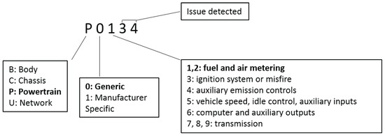 In OBD-II systems, the diagnostic trouble codes (DTCs) are standardized to allow drivers and repair shops to easily diagnose and repair vehicles. However, manufacturers were permitted to include additional exclusive codes. Four classes of codes were specified for distinctive functions of the vehicle. There are five characters in total to represent each DTC. The first character is an English alphabet letter (either B, C, P or U) to indicate the malfunctioned areas. The remaining four characters are digits. The second code indicates whether the DTC is defined by the SAE or manufacturer specific; the third character shows the area of the vehicle system, and the remaining two characters are hexadecimals used to represent the issue detected, as shown in Figure 3.