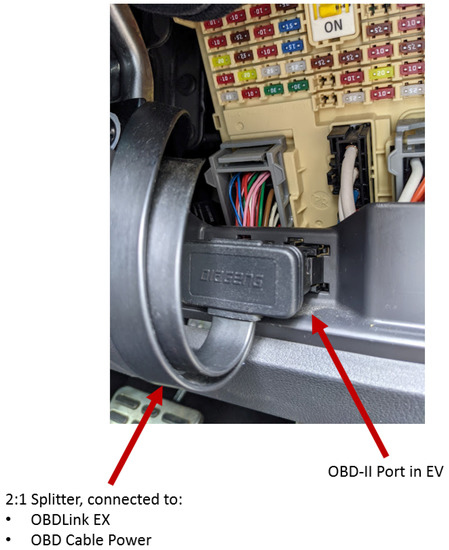 Figure 4 shows the block diagram of the OBD-II system developed and installed in the two Hyundai Ioniq Battery Electric cars. A Raspberry Pi Zero W was selected as the microcomputer unit to communicate with the BEV because it is low-cost, has the necessary features (USB, WiFi and SD card storage) and it is small in size. It periodically sends PID requests to the BEV and receives the responses. This device is a low-cost option with WiFi connectivity so that the data can be uploaded to the server for real-time monitoring. The OBDLink EX contains an STN 2230 chip which is fully compatible with the ELM AT 327 command set to convert messages between the OBD-II protocol and serial data. It has a male OBD-II connector as well as a male micro USB connector which was plugged into the Raspberry Pi Zero W. An OBD-II power cable was used to convert the 12 V from the OBD-II port to 5 V to run the microcomputer. A 2:1 splitter was used to facilitate both the OBD Link EX and OBD-II power cable connection to the BEV’s OBD-II port. Figure 5 shows the Raspberry Pi Zero W installed in the BEV and Figure 6 shows the splitter connected to the OBD-II port. The total cost of the parts was 92.90 USD and listed in Table 2.
