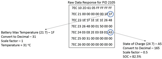 The data captured and uploaded from each PID request were hexadecimal encoded. When uploaded to the web server, processing was required to convert the raw data into information that can be trended and displayed on a developed user interface. The experimental work performed in [27] indicated the location in the data response, scale factor and unit of each parameter and was used to process the data captured. Figure 8 shows the raw data response for PID 2105 and two examples for how two parameters can be interpreted. The location for the battery max temperature is “21 7”, i.e., the 7th hexadecimal number in the row starting with “21” (excluding the header “7EC”). Converting to decimal and applying the scale factor of “1” indicated that the temperature was 31 C. The battery state of charge was read to be 82.5 percent using the same approach. The parameter that was available on the vehicle’s dashboard (battery SOC) was cross-referenced to validate that the data were measured and interpreted accurately. Table 3 shows the full list of parameters contained in the response to PID 2105, along with the conversions.