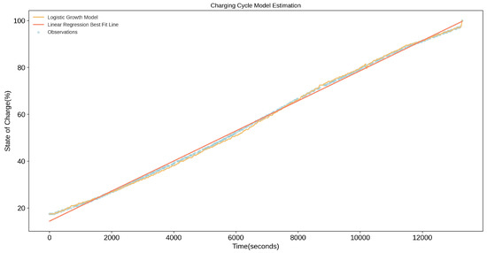 Figure 10 shows the SOC vs. time (captured at a rate of two samples per minute) which can be used to integrate coordinated charging schemes or the adaptive control of electric vehicle supply equipment (EVSE) when combined with grid data [33]. This has the potential to reduce the strain on the grid during peak usage times. These trended data are also useful for developing statistical methods of estimating driver behavior [34]. The SOC data collected were also used to develop charging curves, as shown in Figure 11. For regions that lack data surrounding the BEV charging characteristics, this graph can be used along with equivalent circuit models, such as [35], in simulation software to develop BEV integration grid studies.