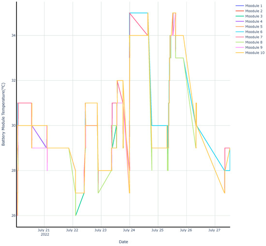 The temperature vs. time graphs in Figure 12 (also captured at a rate of two samples per minute) and the cell voltage graphs in Figure 13 are useful for tracking battery health. Unusually high battery module temperatures or cell voltages can be detected as a means of preventative maintenance, as stated in [2].