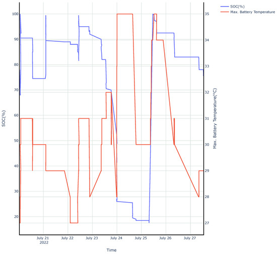 The battery’s health can also be investigated for diagnostics by observing if the temperature behaves higher than nominal voltages during any intervals of the SOC, as seen in Figure 14. This is a critical aspect of battery diagnostics which is otherwise impossible or impractically difficult to detect unless manufacturers implement internal recording systems and associated error codes. Even then, these are often difficult to investigate with low-cost commercially available scanners as most are still tailored to ICE vehicles.