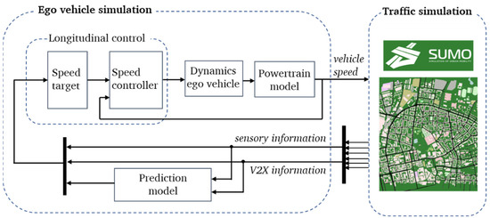 Therefore, a co-simulation environment is created consisting of a detailed vehicle model and a traffic simulation in which an ego vehicle agent with a defined longitudinal control algorithm interacts with a traffic fleet and the traffic infrastructure controlled by a traffic simulator. The co-simulation environment is shown in Figure 1. The ego vehicle simulation comprises of the prediction model for vehicle speeds, the longitudinal control approach and a longitudinal dynamics model for the vehicle. Key outputs of the model are the electric energy demand and the acceleration of the vehicle based on the set acceleration from the longitudinal control. The interface between both simulation parts is the speed of the ego vehicle for the next time step that is passed to the traffic simulation, and the relevant sensory and communication-based information extracted from the traffic environment. In the following sections, the individual simulation parts are presented in more detail.