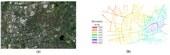 The modeled area of the city center of Darmstadt, Germany is shown in (a). The integrated elevation profile is shown in (b).