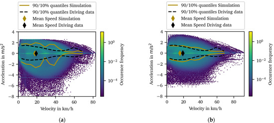 In order to assess the traffic model, real driving data are recorded with a company car that was equipped with a Vector GL2000 data logger. Amongst other signals, the GPS information and velocity/acceleration data are recorded for every trip. The driving data are filtered to only cover the area of Darmstadt that is simulated in SUMO. The filtered dataset contains 470 km of driving data that was recorded with different drivers to yield a wide range of driving styles. To compare the real driving data with the simulated traffic, a driving profile with respect to the occurrence frequencies of vehicle speed and longitudinal acceleration is aggregated for the real driving data and the simulation data, respectively. A number of statistical assessment metrics are then defined for a quantitative comparison. To analyze how well the car-following model reproduces typical acceleration maneuvers in terms of acceleration magnitude and behavior for different vehicle speeds, the 10% and 90% acceleration quantiles as a function of the vehicle speed are calculated. The Mean Squared Error (MSE) between the quantiles of real driving data and simulation data are then determined. Additionally, some key assessment metrics of the driving profiles such as the mean speed and the percentages of standstill and strong decelerations below −3 m/s2 are taken into account. Figure 3 shows a comparison of the simulated driving profiles with the default model parameters of the EIDM and the optimized parameter set. The accelerations in the real driving data mostly stay below 2 m/s2 and decrease towards a vehicle speed of 50 km/h, as this is the dominant vehicle speed limit in the city center. With the default model parameter set, the acceleration of the traffic vehicles tends to be too high compared to the real driving data of the company car, even though buses and trucks are also modeled in the simulation with lower maximum accelerations. A similar conclusion can be drawn for the decelerations which are significantly smaller in the real driving data set. Therefore, both the maximum acceleration and desired deceleration are reduced across all vehicle types to yield a better agreement of real driving data and simulated data with respect to acceleration, as shown in Figure 3b. The mean speed of the driving profile for the default parameter set, on the other hand, is closer to the mean speed of the real driving data. However, there is a higher percentage of driving in areas with a reduced vehicle speed limit of 30 km/h in the simulation, hence the mean speed is generally expected to be lower.