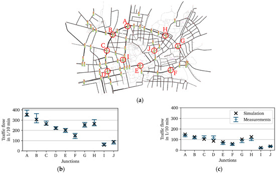 In contrast to more complex demand modeling approaches for transport systems, we use the tools available in SUMO for a simple and efficient generation of traffic demand, since we do not intend to accurately model the traffic demand and supply for the scope of our work. A multitude of routes is first defined for the traffic with the SUMO-internal OSM Web Wizard tool, which generates a traffic demand based on a probability distribution influenced by two parameters, the Through Traffic Factor and the Count parameter. The former defines the likeliness of routes starting and ending at the boundary of the traffic network, and the latter describes how many vehicles are generated per hour and lane-kilometer. The departure times and distribution of vehicles on the routes are adapted afterwards to show a high agreement with the aggregated real traffic flows at every junction. In order to create representative traffic flows for validation based on the traffic data, the traffic flow at a specific junction is obtained for a time period of one hour and over 5 weekdays for one week. Thus, the standard deviation indicates the variation of the traffic flow on different weekdays. As shown in Figure 4b,c, almost all of the simulated traffic flows are within the standard deviation across different days of the week. The results do not necessarily prove a comprehensive validation of the real and simulated traffic demand, but indicate that there is a good agreement with the investigated traffic flows across the traffic network.