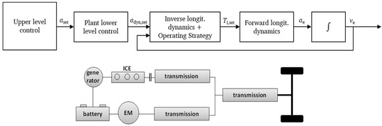 Overview of the control architecture and the vehicle model which is based on the generic powertrain model shown on the bottom and the simplified lower level control.