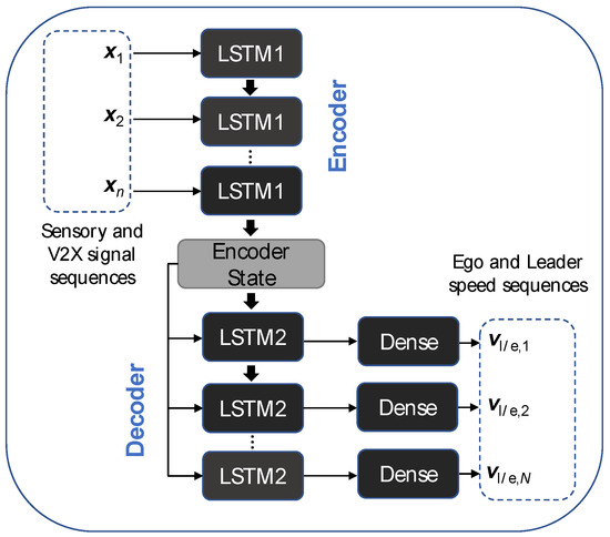 Here, f, i and o denote the input, output and forget gate activation vectors, respectively, c and h the cell state and hidden state vectors, W, U and b the weight matrices and bias vectors and f the nonlinear activation functions. The final hidden state of the encoder is referred to as the encoder state which has encoded all the relevant temporal information of the input sequences in a fixed length vector. It is then used as input for every time step of the LSTM layer of the decoder (LSTM2). Additionally, the final hidden and cell states of the encoder are used as initial values for the hidden and cell state of the decoder to preserve the information encoded in the cell state. The hidden state sequence of the decoder is processed further in a subsequent fully-connected (dense) layer with a Rectified Linear Unit (ReLU) activation and mapped onto the two output sequences of leader and ego speed with a linear activation.