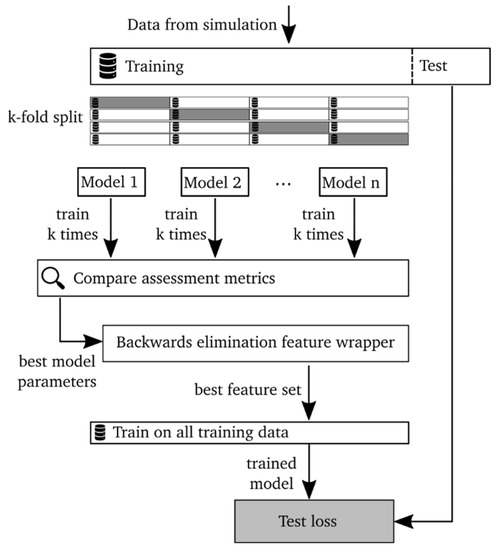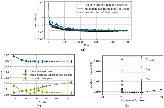 All training processes in this work are conducted in a Tensorflow Keras environment with the Adam algorithm, which currently is one of the state-of-the-art training algorithms [44]. Note that the default value for from the Keras implementation had to be increased by a few magnitudes for numerical stability of the optimization. The training runs for 500 epochs which has shown to be a robust number for a convergence of the validation loss. In order to find the optimal size of the neural network and the best feature set, a two-stage model selection process is derived which is presented in Figure 8.