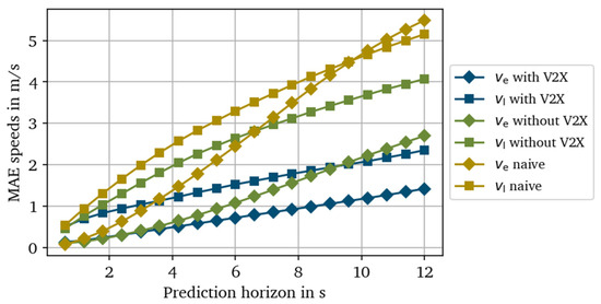 Generally, the speed of the ego vehicle can be predicted with lower errors than the leader speed because it is subject to leader changes due to turning processes or cut-in maneuvers. The mean loss of ego speed at the end of the prediction horizon (t = 12 s) of the V2X-based model is 47% lower compared to the model without V2X features and 72% lower compared to the naive model. For the leader speed, a similar tendency is identified (−42% and −57%). Therefore, a significant benefit in using the V2X information for the prediction task can be stated. When comparing the results to other studies, the differences in the underlying training and test data must be taken into account. However, a MAE of approximately 2.2 m/s for the prediction of leader speed at 10 s is reported in [17] for an enhanced Gaussian Process. Hence, this approach leads to a very similar performance of the prediction model assuming a comparable test data set. In [16], both a naive constant acceleration estimator and an LSTM-based approach are compared for the prediction of ego vehicle speed. The RMSE for the naive and LSTM-based approaches in this study are approximately 5.3 m/s and 1.8 m/s, respectively. Both values are in the same range as for the proposed approach here.