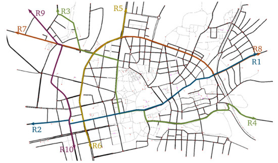 To analyze the behavior of the proposed longitudinal control approach Cp in the presented simulation environment, a number of routes throughout the traffic net and different BEV with varying powertrain specifications are defined. In this study, 10 routes shown in Figure 11 with 6 different starting times are chosen which leads to a total amount of 217 driven km.