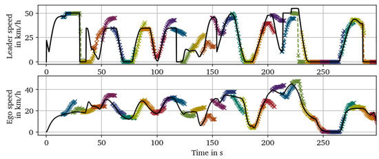 The results of the previously defined case study are summarized in this section. At first, the longitudinal control is discussed for one of the defined routes in more detail. The estimated vehicle speed trajectories over the course of Route 5 are shown in Figure 12. As mentioned before, the leader speed trajectory contains some discontinuities due to the switching of detected leading objects (vehicles/TLS) which makes the prediction much more challenging. However, the general trends show a good agreement with the actual trajectory. In particular, the starts of deceleration maneuvers are often correctly predicted. With respect to the ego speed, the prediction model incorrectly anticipates a deceleration twice at t = 150 s and t = 250 s, but otherwise achieves a high prediction accuracy along the route.
