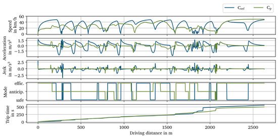 In Figure 13, exemplary results for vehicle speed, acceleration and jerk as a function of the driven distance on Route 5 are shown for Cp and Cref. Generally, Cp operates 44% of the time in the anticipatory control mode and 30% in efficient speed mode and only switches into safe speed mode when the headway to the leader is too small. In the first section of the route, several stops at junctions that occur with the reference control Cref can be avoided by first tracking a set speed below the lane speed limit of 50 km/h and then switching into anticipatory control to track the predicted mean speed of the leader’s trajectory. The trip time up to a driving distance of 1500 m is nearly identical, although the accelerations with Cp overall are considerably lower. On this single exemplary route, the BEV-1 with Cp has a significantly lower consumption of 12.77 kWh/km in comparison to 15.59 kWh/km with Cref. This reduction is mainly caused by the less frequent braking, lowering the overall breaking losses. Even though the BEV are able to recuperate some of the kinetic energy when braking, a significant percentage of the energy is lost during the conversion of energy in the electric machine.