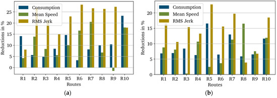 When analyzing the performance indicators on the different routes individually, there is a big variance in the differences between Cp and Cref. The results are shown in Figure 14 for both the rush hour and the off-peak period traffic models of BEV-1. In general, Cp achieves a reduction in the energy consumption across all routes and traffic models of 3.3–23.2% while lowering the mean speed up to 20.5%. However, there are several routes, for instance, R9 during rush hour or R3 during the off-peak period, in which using Cp results in a significant reduction in energy consumption while sustaining the same mean speed. Regarding the jerk, the more anticipatory driving with Cp reduces the RMS of jerk across all routes up to 28.2%.