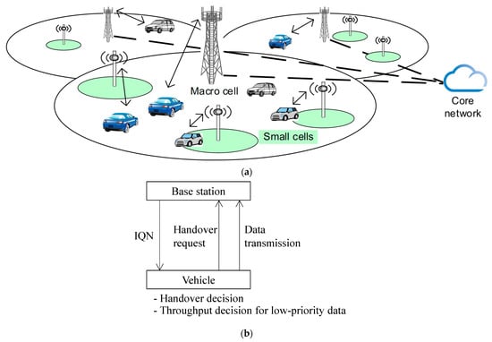 Figure 1 shows an outline of the system model and proposed algorithm. The vehicles use wireless access networks of a heterogenous cellular system, where the macro and small cells exist as shown in Figure 1a. The overview of the proposed algorithm is shown in Figure 1b. The base station periodically transmits IQN to vehicles; each vehicle autonomically decides the handover request and the required throughput of low-priority data based on the IQN information and transmits this. Then, the optimization functions of and , the throughput and congestion indicators defined in Section 3.2, are balanced. Because there are two optimization functions, the proposed algorithm is categorized as multi-purpose optimization. In conventional scheduling algorithms of cellular systems, a central base station optimizes the system capacity and fairness among user terminals based on feedback from them. Thus, this multi-purpose optimization can be conducted by quasi-optimizing schemes such as divide and conquer or dynamic programming. However, in this study, the optimization problem corresponds to multi-agent optimization where each vehicle autonomically determines the answer in multiple cells and is categorized as a game strategy []. Here, IQN is essentially designed to be used for each vehicle, and any collaborative or information sharing of other vehicles is not included. Furthermore, if more optimized solutions are required at each vehicle as base station scheduling, inter-vehicle information needs to be shared, which requires additional V2V links or optional IQN information. However, using additional wireless resources for V2V links or making additional specifications in IQN is not practical. Therefore, in this study, we use a non-cooperative game algorithm for optimization.