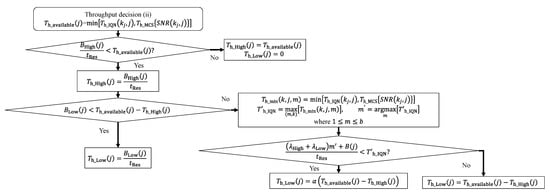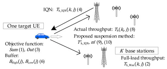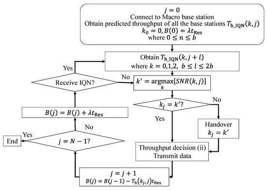 where is the received signal-to-noise ratio (SNR) between the vehicle and base station, and is the throughput value calculated using a MCS table []. Here, can be obtained at the vehicle side using the received downlink signals in the time-division duplex system of 5G, or information in the physical downlink control channel (PDCCH). Using (5), the proposed scheme adjusts the actual transmission throughput as the minimum value between the IQN value and SNR-based throughput. Figure 4 shows the transmission flowchart of the target vehicle using IQN. We assume that the vehicle is connected to a macro base station at time , and is already known for . The buffer to be transmitted from the vehicle is denoted as [Mbit], and , in which is the average data generation rate. Next, the vehicle receives IQN and obtain for . Then, the vehicle searches for the base station , which maximizes the SNR. If is different from , the vehicle requests a handover to the current base station, and sets . The actual throughput (actual transmitting data volume) is then determined by the proposed algorithm described in the Section 3.4, and the data in the buffer are transmitted. After transmission, the vehicle sets , updates as , and confirms whether it is still in the target area, i.e., . In such a case, the predicted QoS is updated when the IQN is received, and this flowchart is iterated until time .