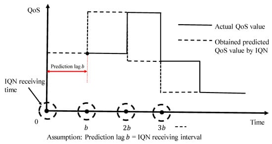 IQN is the notification of QoS prediction between base station and vehicle []. We assume that the IQN information is a predicted available throughput value of base stations, and the prediction is perfectly performed by the base stations and perfectly informed to the vehicles. Figure 2 shows an overview of the proposed algorithm with main parameters of this study. One target vehicle and base stations exist, and the target vehicle periodically receives IQNs from one of the base stations, calculates a few parameters, and adaptively changes the uplink transmission volume. Because of the independent control, this model does not lose generality even when there are many vehicles. Detailed explanations of the equations in the figure are given in the following. The relation between IQN received time and QoS predicted time is shown in Figure 3. The vehicle is notified of the QoS value that is effective at the time from to by the IQN received at time , hence is a prediction lag. In addition, it is assumed that the vehicle receives IQN periodically at the interval of . Then, the vehicle receives IQN at time and obtains [Mbps] that includes predicted throughput values of all base stations from time to , where. Here, it is theoretically possible to perform time-waiting suspension of low-priority data using IQN for the same base station. However, because vehicles are usually moving, this study assumes that suspended data are sent to a nearby base station using handover.