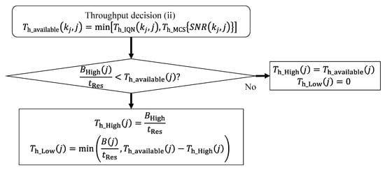 Figure 5 shows the throughput decision algorithm of the proposed adaptive transmission suspension scheme. First, the available throughput is obtained using (5). Next, the target vehicle compares with the required throughput to transmit high priority data, given by . Because the high priority data should be transmitted immediately, when is larger than , the vehicle makes the actual high-priority data throughput as . If not, the vehicle makes . In this case, there is no additional margin to transmit low priority data, and hence, the vehicle decides and finishes the flowchart. Next, the target vehicle compares with the required throughput to transmit low priority data, given by . When is larger, the vehicle recognizes that the current base station is not crowded, makes the actual throughput as , and finishes the flowchart. If not, the vehicle searches for the maximum incoming throughput and its time within the IQN information. In particular, using and, the for time to and time for are searched, as shown in Figure 5. The and are obtained as follows: