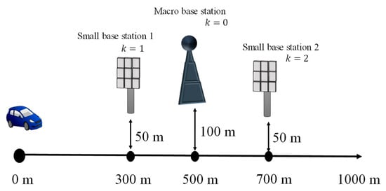 Figure 7 shows the simulation scenario used in this study. The target vehicle runs a 1-km long straight road from left to right at a constant speed of 60 km/h. There are three base stations () comprising a heterogeneous network: one macro base station and two small base stations. The macro base station, labeled as , is deployed at 500 m from the left with an antenna height of 25 m, and the small base stations 1 and 2, labeled as, are located at 300 m and 700 m, respectively, both with the antenna height of 10 m. These values are taken from 5G standard models [] (Table 1, Table 2 and Table 3), where the vehicle velocity is between 10 and 120 km/h, and the inter-site distance of base stations in a dense urban scenario is 200 m. Note that because we focus on evaluating the basic performance of the proposed scheme, the simulation scenario is configured as a simple one. More complicated scenarios such as those with multiple vehicles or area expansion will be considered in future studies.
