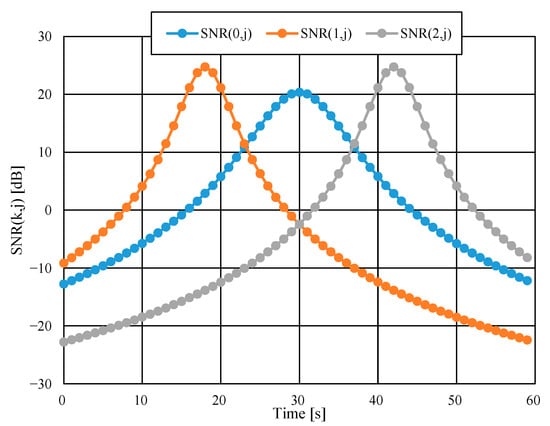 The average received trajectory at each base station is shown in Figure 8 using the parameters shown in Table 1 and Table 2. The horizontal and vertical axes represent the time and average SNR, respectively. The results confirm that for each becomes the maximum when the vehicle passes through each base station. Typically, the base station with the maximum changes at time s and 37 s. Thus, it can be said that the vehicle is likely to perform handover a few times at the above-mentioned times because of change in SNR and the fading effect. It can be observed from Figure 8 that the maximum average SNR is 23.5 dB in this scenario.