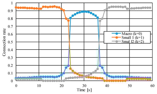 Figure 9 shows the connection rate of the vehicle to each base station. It was confirmed that the higher the SNR, the higher the connection rates. It was also found that the vehicle tended to perform handover from small base station 1 to macro base station at time 23–24 s, and from macro base station to small base station 2 at time 36–37 s. The result coincides with the one shown in Figure 8.