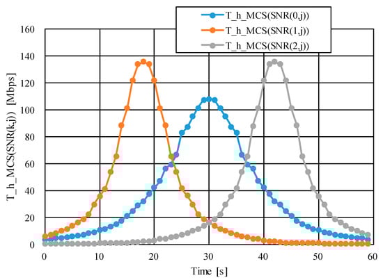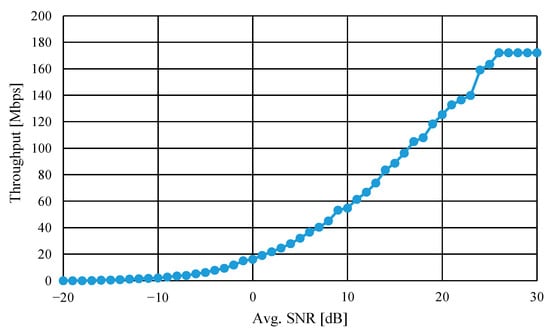 To obtain , we evaluated the simple one-link throughput performance versus received SNR under the condition shown in Table 1 and the MCS table shown in [] by conducting the MATLAB simulation. The result is shown in Figure 10, where the retransmission is not considered. It is shown that the limitation of uplink throughput is 172.08 Mbps at the received SNR of 26 dB. Therefore, the capacity of the base station is set to Mbps. Next, versus time in the simulation scenario was calculated as shown in Figure 11, which was obtained by adopting the result obtained from Figure 10. The plots shown in Figure 11 are calculated by obtaining the average of 100,000 trials. The result confirms that is basically following the result obtained from Figure 8, and that the user throughput is smaller than even when the SNR becomes the maximum in the scenario such as at time 18 s or 42 s. Hereafter, we use the throughput values of Figure 10 as .