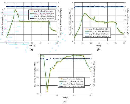 The throughput characteristics under scenario A are shown in Figure 12a, where the horizontal and vertical axes represent time and throughputs of low (left) and high (right) priority data, respectively. It can be observed from the results that is constantly transmitted at 8 kbps and increases from 0 s to 10 s. This is because small base station 1 is empty and increases during this time. After this time, the vehicle completely transmits the stored data in the buffer, and immediately transmits the data after 15 s. Then, decreases after 50 s because the distance between the vehicle and small base station 2 increases and decreases. The proposed scheme does not suspend the data because all base stations are empty, and as a result, the characteristics of the proposed and conventional schemes are the same.