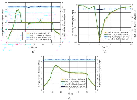 Figure 13a shows the throughput characteristics of scenario C. It can be seen that the low-priority throughput decreases at 24 s when the vehicle tends to perform handover from empty small base station 1 to the congested macro base station. Because the macro base station is congested and is not high enough to transmit the data immediately, there exists some accumulated buffer. The proposed scheme then causes the transmission suspension of the low-priority data in the buffer to the congested macro base station. Sometimes the vehicle cannot transmit the suspended data due to the instantaneous SNR degradation. Consequently, 0.1 Mbps of throughput degradation occurs compared to the conventional scheme. Figure 13b shows the enlarged view of Figure 13a. Similar to scenario B, the summation of degradation of the proposed scheme is 0.05 Mbits, which is sufficiently small compared to the summation of the generated data of 900.48 Mbits.