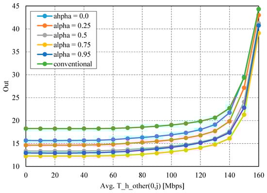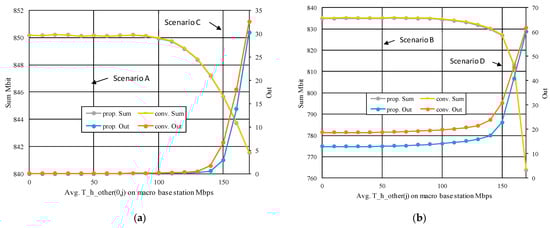 Figure 14b shows the same and performances with Mbps, which simulates the congested small base stations. It can be observed that the degradation of Sum remains small in the proposed scheme, even in the crowded scenario. This is because of the small suspension rate of 5%, and the utilization of the IQN as described in Figure 14a. In contrast, the Out performance of the proposed scheme is better than that of the conventional scheme in all regions. In this regard, the conventional scheme does not consider the congestion of base stations, whereas the proposed scheme prudently avoids congestion, and effectively improves the Out performance in crowded situations.