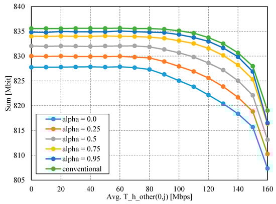 Mbps is assumed to simulate the congested small base stations in the same way as shown in Figure 14b. Figure 15 shows the performance. When is set to 1, the performance becomes the same as the conventional scheme because of no suspension. We change from to 0.75 with a step of 0.25 and 0.95. It can be confirmed that when is larger, also becomes lager in the proposed scheme, although all curves are lower than that of the conventional scheme. This is because when is smaller, more data are suspended, and sometimes the accumulated bits cannot be transmitted due to an instantaneous SNR reduction or a handover. Because no suspension occurred in the conventional scheme, the best performance was obtained. Figure 16 shows the performances, where a better is obtained with larger . However, the performnace is slightly degraded at . When is small, the suspended data increase and becomes larger according to time processing. Consequently, the buffer becomes large, and the suspension condition is not satisfied in the lower part of Figure 5. Therefore, full data transmission was always selected, and the congestion could not be reduced. It was shown that should be sufficiently large in the proposed scheme, i.e., the data suspension should not be large in the IQN-based predictive transmission. Although the optimal may change according to and the channel model, the result of Figure 16 indicates that the optimal volume of data suspention exists with regard to the congestion reduction performance.