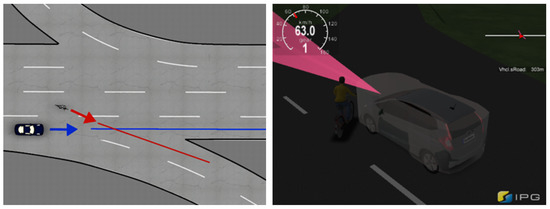 Figure 4 shows the collision of a car and a bicyclist with the parameters specified. Due to the limited possibilities of the CarMaker, a cyclist was used instead of a pedestrian with a bicycle. We have to mention that the IPG CarMaker defines the field of view based on the horizontal width and vertical height of the visible image area in the case of a specific working distance defined by the range parameter.
