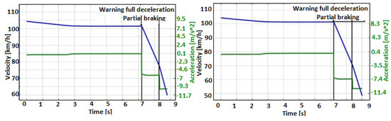 Firstly, we need to mention speed. Even if we cannot compare the impact of velocity on human-controlled and automated driving yet, we can observe that velocity has a crucial effect on the risk of accident occurrence in reconstructed accidents. For example, in the case of the fourth accident, the simulation proved that if the vehicle speed had been less than 28 km/h, the collision could have been avoided. This could call the attention of industrial actors to apply more strict control rules in the case of autonomous mode. Similarly, we recognised that some of the technical parameters of the control process, like braking pressure or TTC that affect users’ satisfaction directly, can significantly influence the probability of accident occurrence. For example, the first investigated collision could have been avoided after increasing the value of the partial braking pressure to 60% of maximal braking pressure. In the case of the second accident, the collision could have been avoided only if the TTC parameter had been set to 3.6 s. Following this, it seems reasonable to consider safety with an increased weight compared to user experience when identifying these parameters’ values.