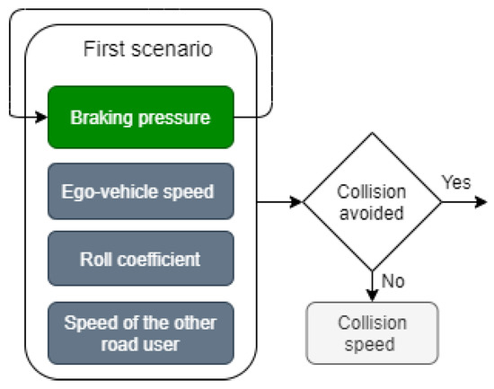 Two variables were chosen for the sensitivity analysis [49]. This is the variable of maximum braking pressure during partial braking and the roll friction coefficient. We chose these parameters based on accident situations analysed in reality. After the selection, we also compared the factors used in the test method with the capabilities of the simulation software. Partial braking is a phase of the Advanced Emergency Braking System (AEBS), when the system brakings partially. Partial braking only requires information from a long-range RADAR sensor (LRR).