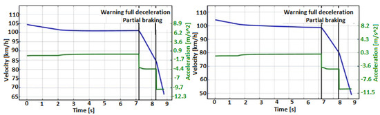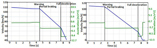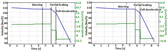 In accordance with the above, the structure and parameters of the AEBS function used during the tests were uniforms. The AEBS function is controlled based on the estimated Stopping Distance (—Equation (1) and Time-to-Collision parameters (Equations (3) and (5). Accordingly, the formulas taken into account in the control method are introduced below [38].