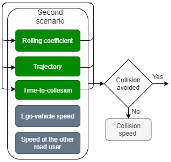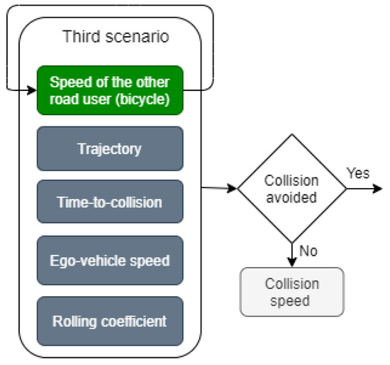 In the third scenario, we considered ego-vehicle speed, roll coefficient, Time-to-Collision, trajectory and speed of the other road users to reconstruct the analysed crash. We modified the speed of the other road user—bicycle speed—(indicated by green background) during the evaluation to investigate the impact of this factor on the outcomes of the crash (Figure 14).