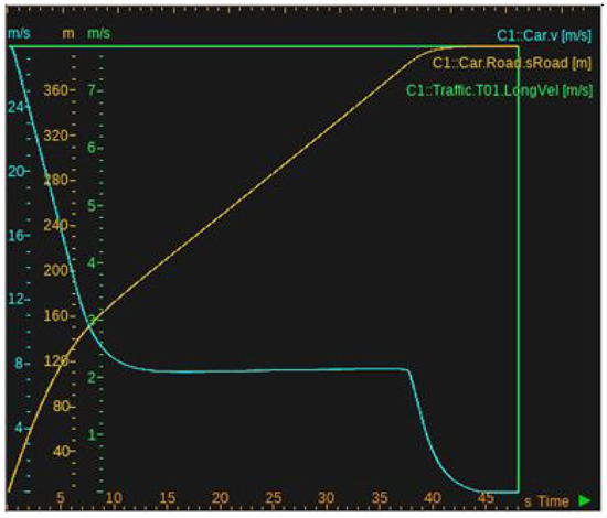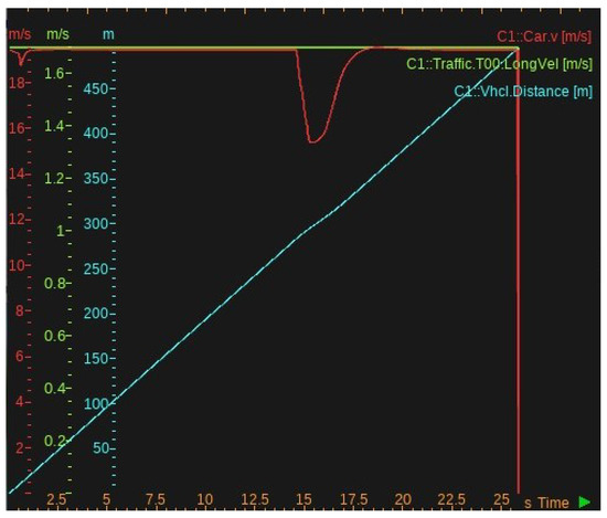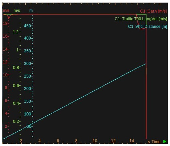 Figure 15 and Figure 16 shows a graph with reduced cyclist speed. Due to the reduced speed of the cyclist, the car will go through the intersection faster, and there will be no collision. The simulation ends when the ego vehicle reaches the end of the testing highway—500 m. The adaptive cruise control system (ACC) will be implemented within this third scenario.
