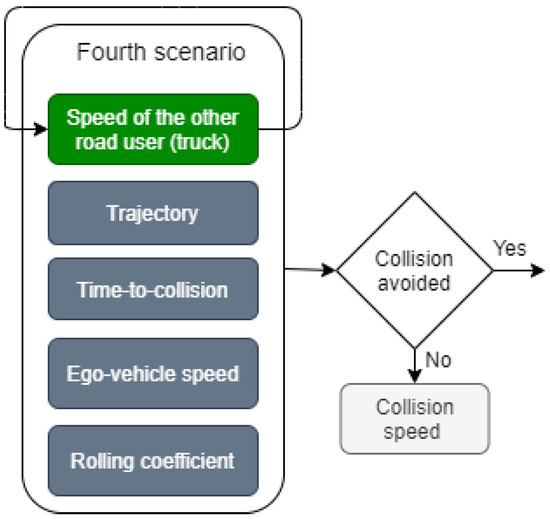In the fourth scenario, we considered ego-vehicle speed, roll coefficient, Time-to-Collision, trajectory and speed of the other road users to reconstruct the analysed crash. We modified the speed of the other road user—truck speed—(indicated by green background) during the evaluation to investigate the impact of this factor on the outcomes of the crash (Figure 18).