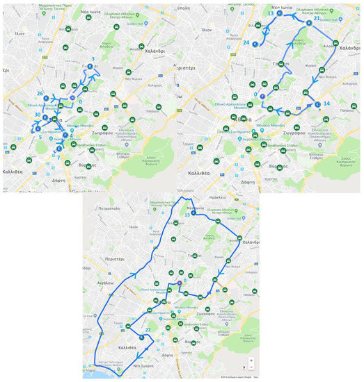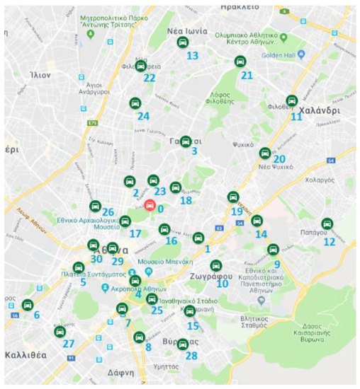 The algorithm is implemented in Python 2.7 and run on a computer with a 3.0 GHz processor and a 5.0 GB RAM. A set of 30 points in the central area of Athens is chosen as a testbed with corresponding points shown in Figure 1, where the stops and the starting node (depot) are shown with green and red colors, respectively. Furthermore, the travel time matrix is derived using Google Maps, using the shortest distance and avoiding freeways wherever possible.
