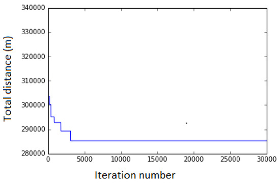 It should be noted that for any value of fleet size above 11 vehicles the solution is the same, while for any value under 11 the problem is infeasible due to capacity and range constraints. The evolution of the objective function values during the optimization process is presented in Figure 2. As seen, a best value is found relatively fast (before 5000 iterations).