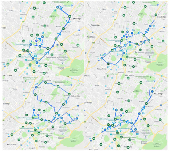 Routes for vehicles 1 (top left), 2 (top right), 3 (bottom left), 4 (bottom right).