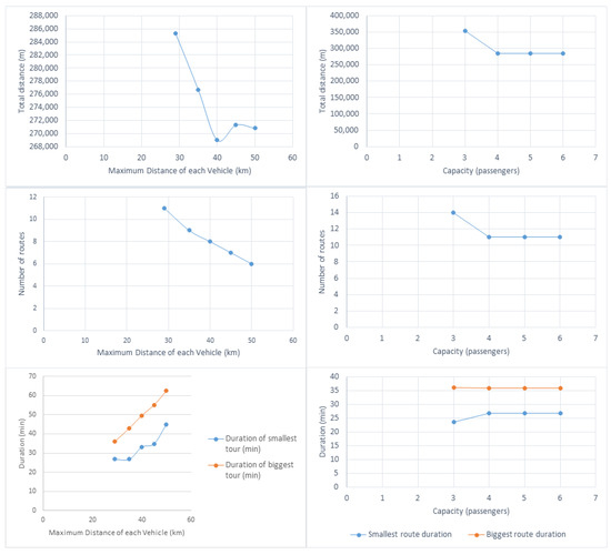 A sensitivity analysis for the vehicle range, capacity and passenger demand is performed to investigate algorithm robustness. Tests are conducted for maximum range values of 35, 40, 45 and 50 kilometers and for vehicle capacity values ranging from 3 to 6 passengers. Passenger demand variations within +/− 20% and +/− 50% were examined. The results for the range and capacity constraints are shown in Figure 6.