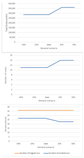 As expected, increasing vehicle capacity reduces both the objective function values and the number of required routes. In contrast, restricting the maximum capacity to three leads to a total distance value of 350 km, a 24% increase from 285.3 km, which is the result for the capacity values of four, five and six. Furthermore, 14 total routes are needed when the capacity is set to three, while 11 routes are needed with a capacity of four, five and six passengers. This occurs because each vehicle can serve a higher number of customers with the increased capacity. Time durations for the largest and smallest route are also investigated. As expected, increasing maximum vehicle range results in higher travel times, while an almost linear pattern may be observed in that case. As a general note, average travel times increase for higher capacity values, as travel times for the smallest routes increase while durations for the biggest routes remain virtually unchanged. However, maximum range constraints restrict travel times up to a certain limit. We also examined values corresponding to −50%, −25%, +25% and +50% compared with the initial demand. Due to capacity constraints, values exceeding capacity are rounded to the maximum allowed value. Accordingly, values under unity are rounded to one. Results are shown in Figure 7.