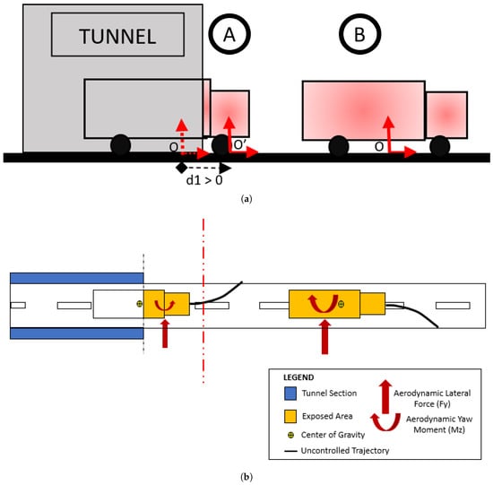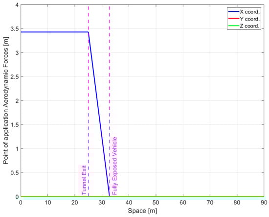 In Equation (4), is the aerodynamic yaw moment applied to the center of gravity, taking into account the translation of the forces application point due to the exposed area variation. In the case where the vehicle is completely inside the tunnel, of course, no aerodynamic forces are applied to the system except for the aerodynamic drag due to the vehicle speed itself (the wind is always coming orthogonal to the tunnel, never from a parallel direction).