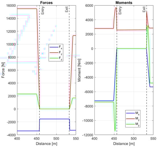A plot of the time history of aerodynamic forces and moments in the proximity of one of the tunnels of the scenario is shown in Figure 6 (for sake of clarity, a non-turbulent wind is considered). Here, the reversal of yaw moment as the vehicle exits the tunnel is clearly visible. This reversal is connected to the movement of the point of application of aerodynamic forces and moments, shown in Figure 5b, while the magnitude of the forces and moments are controlled by the change in the exposed lateral surface area of the vehicle, shown in Figure 5a.