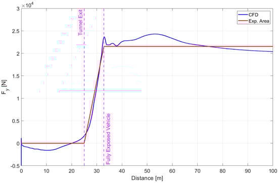 For sake of completeness, it is reported in Figure 8 a comparison between the lateral aerodynamic force evaluated using the exposed area approach above described and a CFD case involving the same lorry used in this work running at 90 km/h with a 25 m/s crosswind at the tunnel exit. The simulated CFD case was taken by the previous work of Semeraro et al. [21]. As can be seen, there is a good agreement between the two methods.